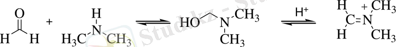 Электрофильді бөлшектер аминнен және формальдегидтен түзілген иминді ион болып табылады. Реакция сутегі атомының енолизациясына қабілеттілігі бар альдегидтер мен кетондар үшін жалпы жеткілікті болып табылады.