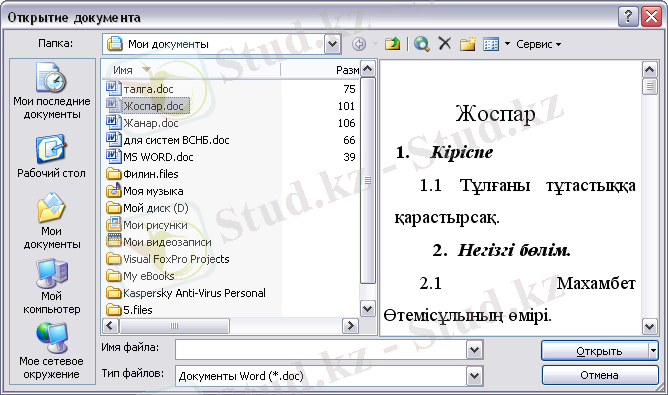 MS WORD - та “Құжат ашу” сұқбат терезесінің мүмкіндіктері