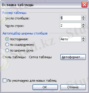Кестені кірістіру батырмасының көмегімен кестені даярлау барысында бағаналар ені олардың саны негізінде автоматты түрде тағайындалады. Ал егер кестені даярлау процесінде бағаналар енін өзіңіз тағайындаңыз келсе, онда Кесте - Кестені кірістіру командасын пайдаланған жөн. Бұл команданың орындалуы нәтижесінде 3-суретте көрсетілгендей “Кестені кірістіру” сұқбат терзесі ашылады да кестенің қажетті параметрлерін өзіңіз тағайындай аласыз.