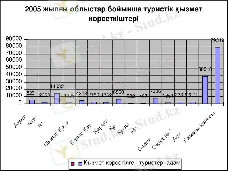 1 сурет. 2005 жылғы облыстар бойынша туристік қызмет көрсеткіштері (автордың жасалуымен)