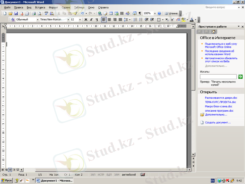 Бас меню арқылы Іске қосу→Бағдарламалар→Microsoft Office→Microsoft Word ) Пуск →Программы→Microsoft Office→Microsoft Word) экранда 6. 1 суретте көрсетілген терезе пайда болады.