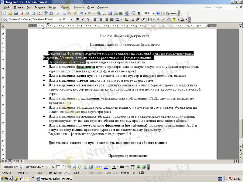 Үзіндіні ерекшелеу мәтінді Көшірмелеу, Кесу, Жою ( Копировать, Вырезать, Удалить ) стандарттық операциялары үшін, сондай-ақ оны басып шығару мен форматтау үшін пайдаланылады.