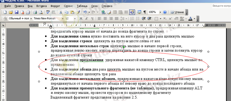 - Үзіндіні ерекшелеу үшін маустың сол жақ батырмасын басылғын күйі ұстай отырып, маустың меңзерін жол бойынша үзіндінің басынан соңына дейін жылжыту керек.