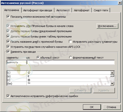 - Автоалмастыру. Бұл коменда жиі қайталанатын қателіктерді автоматтық түзету үшін қызмет етеді. Microsoft Word-та жиі қайталанатын қателіктердің тізімі мен олардың алмастыруы бар. Тізімге жаңа элементтерді үстемелеу үшінҚызмет→Автоалмастыру параметлері(Сервис→ Параметры автозамены) менюі командасын орындау керек, нәтижесінде Автоасмастыру (Автозамена) сұқбаттық терезесі пайда болады. (6. 9 сурет) .