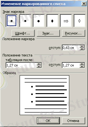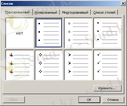 Маркердің түрі мен орнын өзгерту үшін Формат→Тізімдер ( Формат → Списки ) менюі қомандасын орындаңдар. Нәтижесінде Тізім (Списки) сұқбаттық терезесі пайда болады (6. 13 сурет) . Онда керекті маркер түрін таңдау керек немесе маркердің параметрлер терезесін шақыратын Өзгерту ( Изменить ) батырмасын басу керек (6. 14 сурет) .