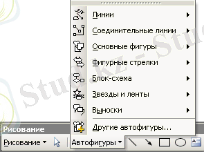 1. Кірістіру ( Вставка ) менюіне Сурет командасын, содан кейін Автофигуралар командасын (7. 2 сурет) немесе Сурет салу ( Рисование ) тақтасының Автофигуралар менюін (7. 7 сурет) таңдаңдар.
