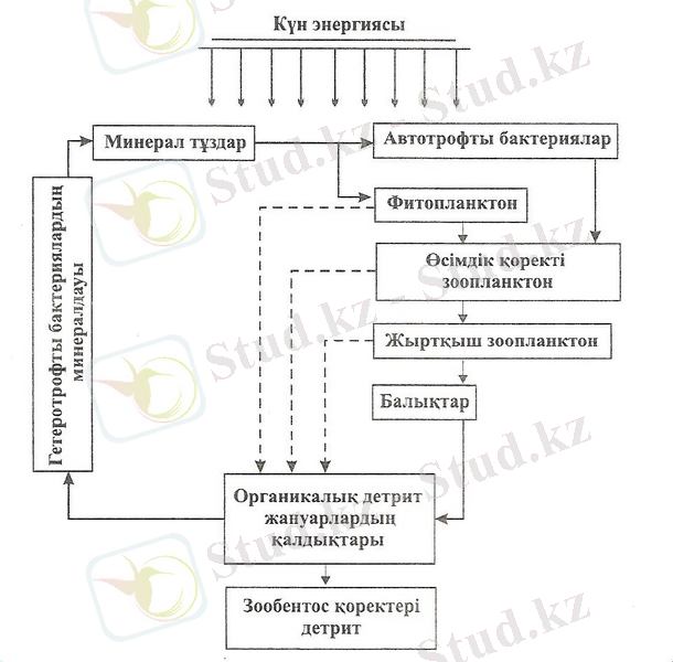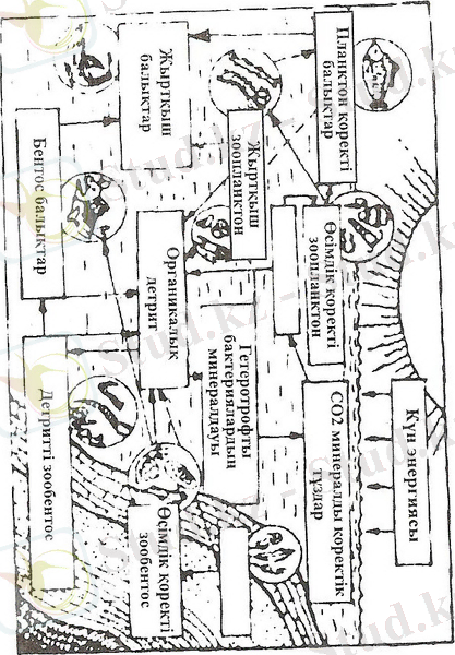 Бүкіл әлемдік мұхит біртекті экологиялық жүйе ретінде оның негізгі ерекшелігі - заттар мен энергияны тасымалдау болып табылады. 1-суретте көрсетілгендей, күн энергиясын мұхиттың беткі қабаттарындағы өздері өсімдік қоректі зоопланктонның қорегі болып саналатын фитопланктондық организмдер сіңіреді. Ал өсімдік қоректі зоопланктон судағы балықтардың қорегі, олардан соңғы деңгейде жыртқыш балықтар орналасады. Судың тереңіндегі фауна негізінен омыртқалы жануарлардан, жарық шығаратын механизмдері бар жыртқыш балықтардан және деструктор - бактериялардан тұрады.
