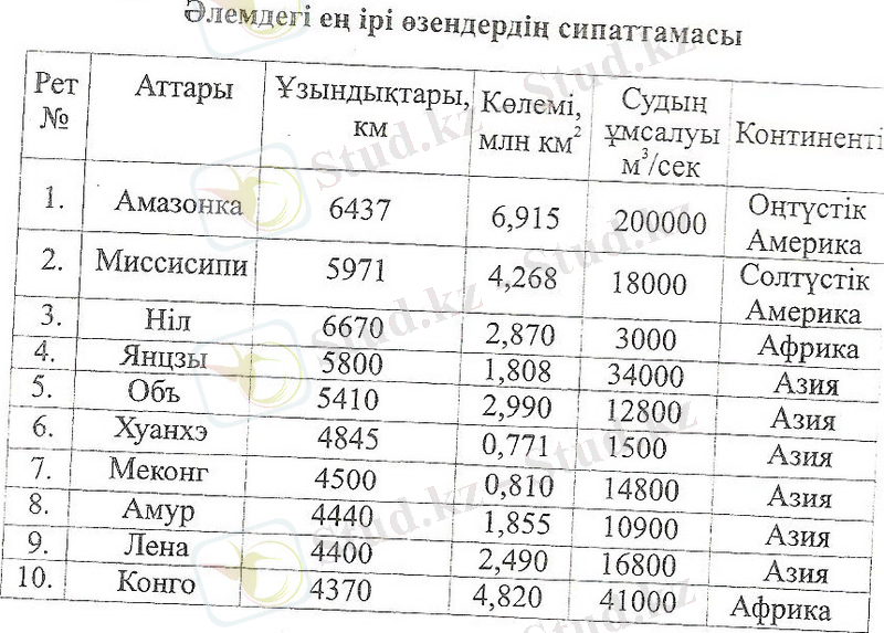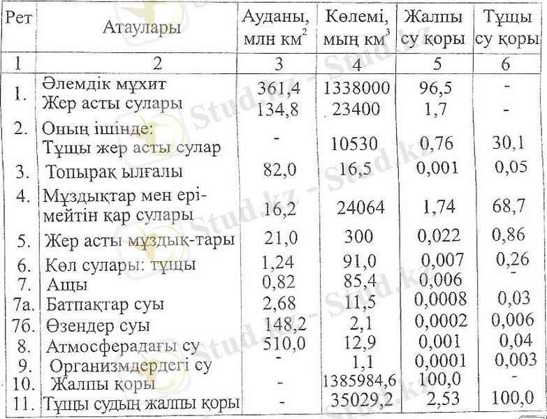 Жер планетасындағы судың жалпы мөлшері 1386 млн. км 3 . Бұл судың 96, 5% - Әлемдік мұхитқа тиесілі. (1-кесте. )