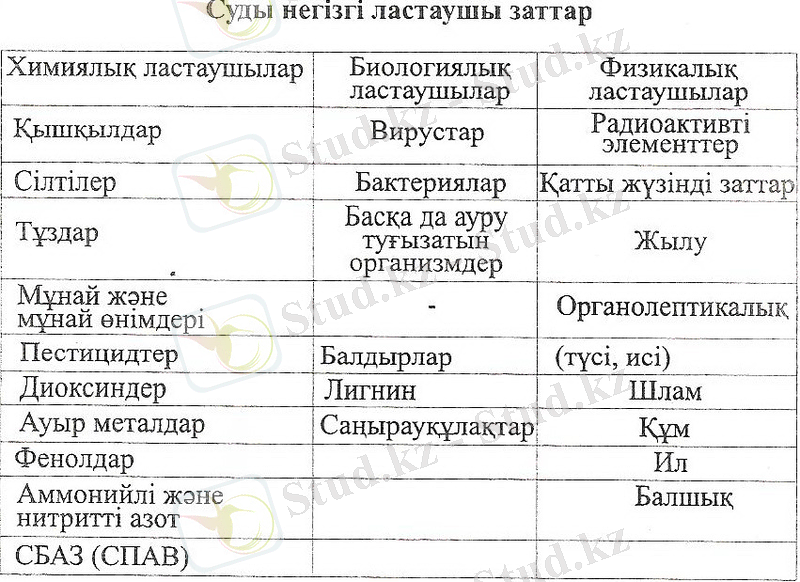 Соңғы жылдары өзен, көл, теңіз бен мұхит суларының ластануы қатты байқалуда. Табиғи суларды ластаушы негізгі көздер төмендегілер: