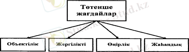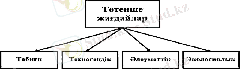 Пайда болу себептеріне байланысты төтенше жағдайларды табиғи, техногендік, әлеуметтік, экологиялық деп жіктеуге болады (1-сурет) .