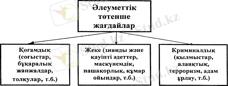 Заманауи қоғамның өмірінде әлеуметтік сипаттағы төтенше жағдайлар (соғыстар, террорлық актілер, адамдарды кепілдікке алу, ұрлық, алаяқтық, зорлық - зомбылық, зиянды мен қауіпті әдеттер, адамдардың жаппай толқуы, т. б. ) ерекше орын алады. Олардың жалпы саны, түрлері, зардап ауқымдары ұдайы өсу үстінде. Әлеуметтік төтенше жағдайлардың спецификалық ерекшелігі мынада: олардың барлығы адамдар арасындағы өзара қарым - қатынас сферасында пайда болады және адам факторына байланысты келеді. Мұндай жағдайларды адамдар саналы түрде жоспарлайды, дайындайды және өздерінің саяси, ұлттық, діни, қылмыстық, қаржылық пен жеке мүдделерін шешу үшін жүргізеді. Бұл мақсаттарына жету үшін олар қатал да сорақы әдістерді қолданады: қорқыту, бопсалау, зорлық-зомбылық, алдау, кепілдікке алу, ұрлық, адам өлтіру, т. б. (5-сурет) .