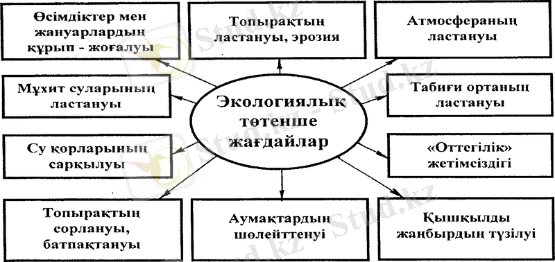 Адамзаттың Жер бетінде комфортты сүруі үшін экологиялық төтенше жағдайларға ерекше мән беруі қажет. Мұндай төтенше жағдайларға мыналар жатады: өсімдіктер мен жануарлардың құрып - жоғалуы, топырақтың ластануы, сорлануы, батпақтануы мен эрозиясы, атмосфераның ластануы, әлемдегі мұхит суларының ластануы, табиғи ортаның ластануы, су қорларының сарқылуы, аумақтардың шөлейттенуі, т. б. жатады (6-сурет) .