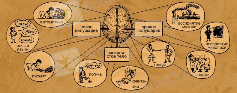 Сурет 3. Мидың сол жақ және оң жақ жарты шарларының атқаратын қызметтері