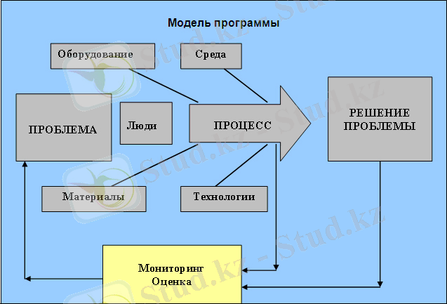 (Бағдарламаның үлгісі, жабдық, орта, шара, адамдар, үдерістер, шараның шешімі, материалдар, технологиялар, мониторинг, бағалау)