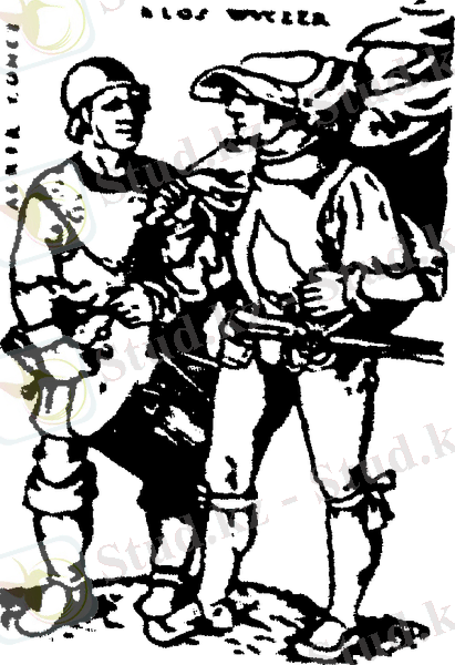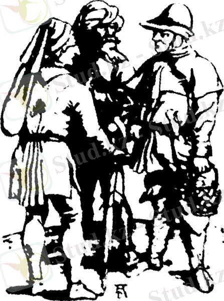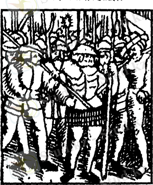Көтеріліске шыққан шаруалардың ту ұстаушысы мен барабаншысы.