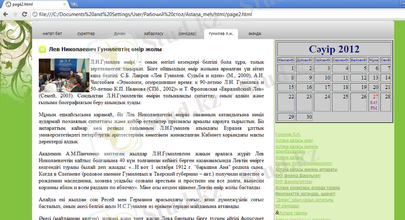 Бұл сайт негізгі беттен - home. html және 7 қосымша: негізгі бет, суреттер, Думан, хабарласу, рәміздер, Гумилев Л. Н, әкімдік парақтарынан тұрады. Кез-келген парақтан басқа кез келген қосымша параққа жеңіл өтуге болады. Олар HTML тілінің <А> . . . </А> тәгтері1 арқылы жасалған [7-9] .