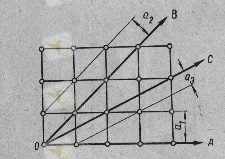 Мысал ретінде куб торының негізгі бағыттарын көрсетуге болады (1. 4. -сурет) . Тор осьтерінің индекстері: ОХ осінің индексі [100], ОУ осінің - [010], OZ осінің - [001] . Жақ диагональдарының индексі: вс жағы диагоналының индексі [011], ас жағы диагоналының - [101], ав жағы диагоналының - [110], кеңістік диагоналының индексі - [111] .