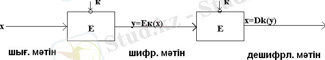 Суреттегі процедура берілетін деректердің мәндерін жасыру үшін қажет. Беру процесі екі алгоритмді пайдаланады: E (Encipherment) және D (Decipherment), әрқайсысы екі кіріс және бір шығысқа ие. Е шифрлеу алгоритмінде шығыстық мәтін k (key) кілтімен қолданылады, яғни шиврленген у мәтінге айналады. Сәйкесінше, D дешифрлеу алгоритмінде у мәтіні k қайта қалыпқа келтіру кілтімен жүзеге асады. Мәтінді аламастыру үшін бір кілтпен пайдаланылтын екі функция шифрлеу - y=Ek(x) үшін және дешифрлеу - x=Dk(y) жұмысын ұйымдастырады: мұндағы k-параметрі E және D функцияларына қатысты. Компьютерлік мәтіндер ASCII коды арқылы беріледі. Мұнда әріптер мен сандар 8-биттік байттарға шифрленген. Сенімділігі: егер кілт ашылған болса алгоритм де толығымен ашық деп есептеледі.