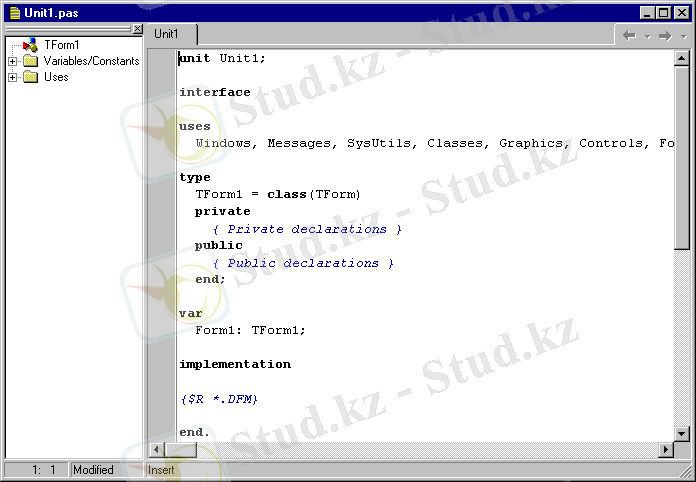 Delphi жүктелгеннен кейін Delphi интерфейсі 4 терезеден тұрады: