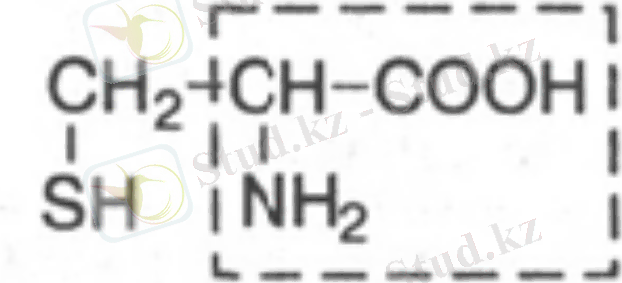 11. Цистеин, α-амино-β-тиопропион қышқылы. Ауыстырылатын амин қышқылы, құрамында сульфгидрил (-SН) тобы бар. Тірі клеткада цистеин екі сутек атомын бөліп шығарып, жаңа екінші амин қышқылы ‒ цистин құрайды, цистеиннің екі қалдығы арасында дисульфидтік (-S-S-) байланыс пайда болады. Цистеин, цистин, метионин органикалық күкірттің көзі, күкірт зат алмасуында маңызды роль атқарады.