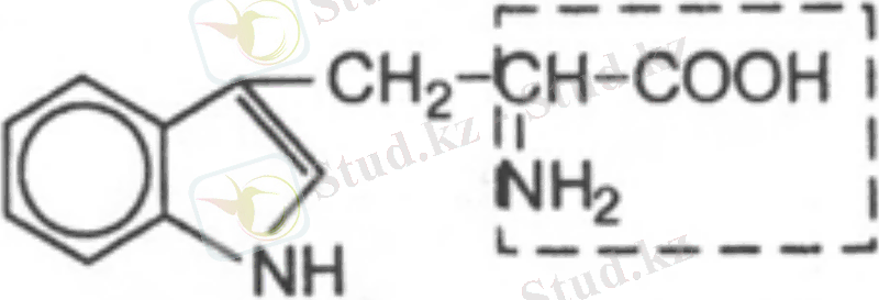 13. Триптофан, α-амино-β-индолилпропион қышқылы. Өте маңызды ауыстырылмайтын амин қышқылы, адам мен жануарлар ұлпасында түзілмейді, табиғи белок құрамында аз мөлшерде кездеседі. Молекуласында гетероциклді сақина-индол бар. Триптофан жетіспесе жыныс бездерінің қызметі нашарлайды.