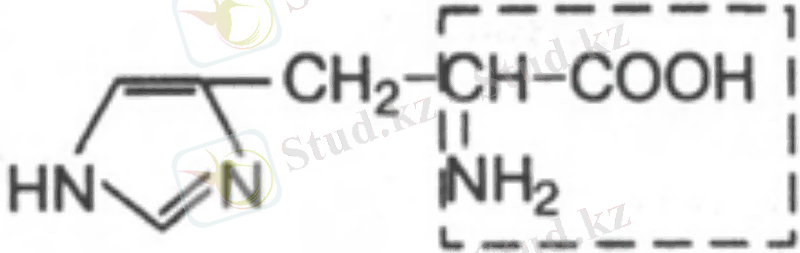 20. Гистидин, α-амино-β-имидазолилпропион қышқылы. Біршама ауыстырылатын амин қышқылы, адам мен жануарлар ұлпасында аз мөлшерде ғана түзіледі. Молекуласында имидазол сақинасы бар, ол ферменттің активтік орталығына кіреді. Белокқа сілтілік қасиет береді.
