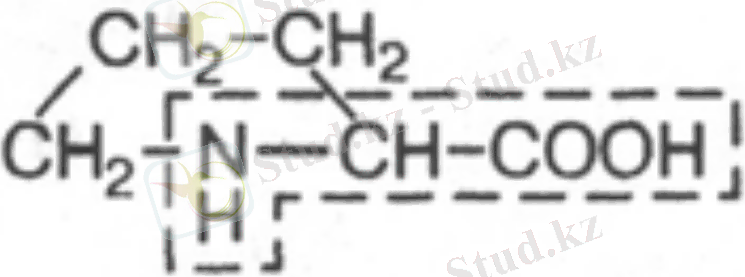 8. Пролин, пирролидин-α-карбон қышқылы. Молекуласында амин (-NH 2 ) тобы бар, амин қышқылы болып есептеледі. Ауыстырылатын амин қышқылы. Көп мөлшерде дәнекер ұлпа белоктарында болады (коллагенде, эластинде) . Пролин сақинасы белок молекуласының құрылымына үлкен әсер етеді.