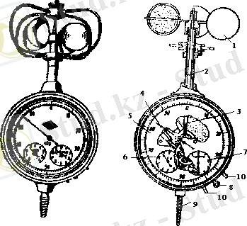 МС-13 табақша типті анемометр (5-сурет) - айқасып орналасқан (4) жарты дөңгелектен, және ойыстары бiр жағына қаратылып жасалған табақшалардан (1) тұрады. Айқасқан жарты дөңгелектер тас тірекке бекітілген тік болат осьтерге бекіген (2), ол ауа лебі кезінде дөңгелекшелердің еркін бір бағытта қозғалуын қамтамасыз етеді. Абайсызда болатын зақымдалулардан айқасқан жарты дөңгелектер екі сым темірлермен есілген каркаспен қорғалған.