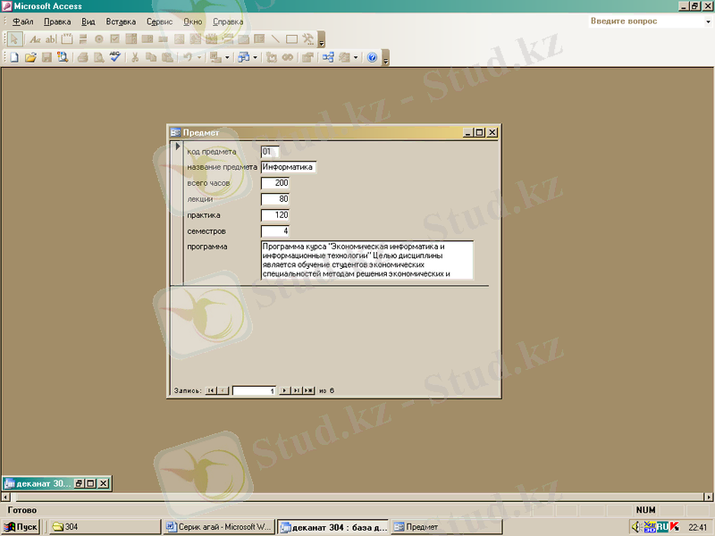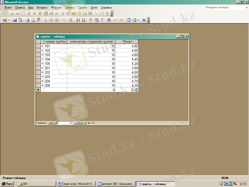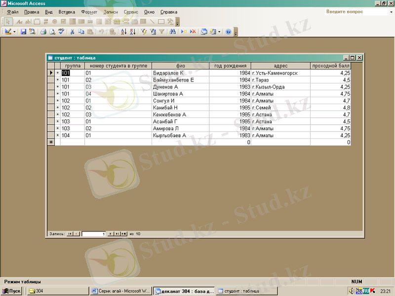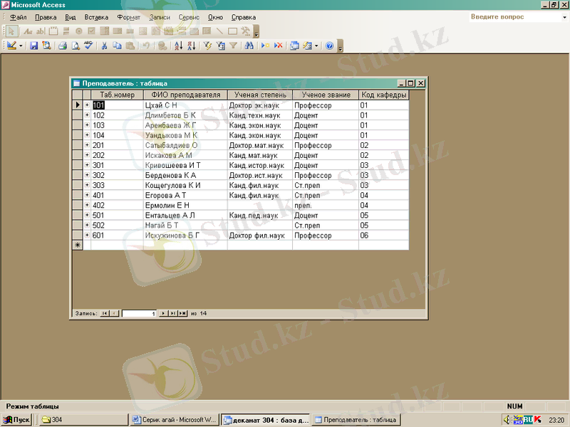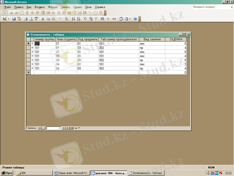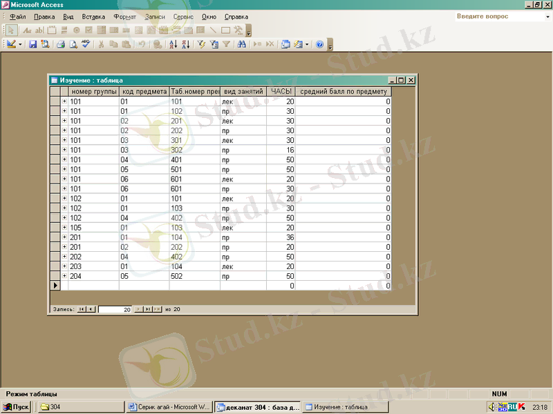 Лабораториялық жұмыста оқу жылының берілген бір семестірінің мәліметтері сақталған деректер базасы берілген. Ол үшін төмендегі мәліметтерді енгіземіз: