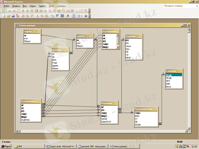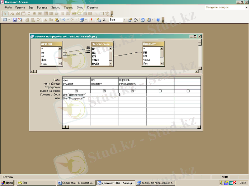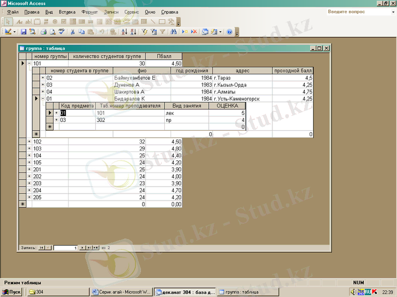 УСПЕВАЕМОСТЬ кестесінен студенттер фамилиясын көру үшін, оған СТУДЕНТ кестесінің жазуларын бағынышты жасаймыз.