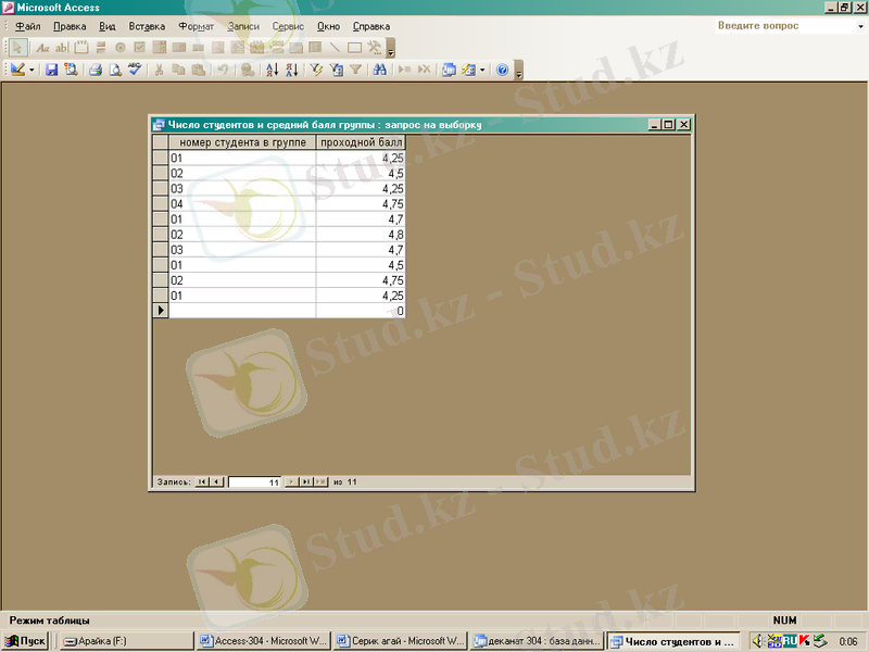 ЧИСЛО СТУДЕНТОВ және СРЕДНИЙ БАЛЛ ГРУППЫ деген кестелердің негізінде сұраныс жасаймыз.