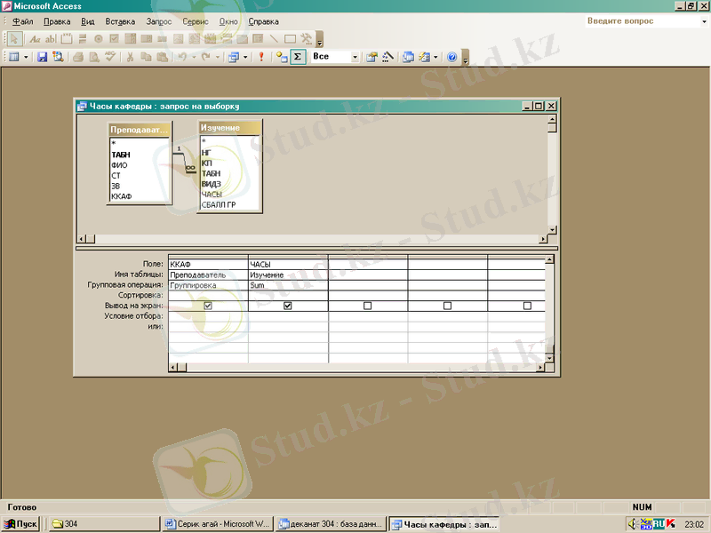 2. Әр бір кафедраның өткізетін сабақтарының санын есептеу үшін, ПРЕПОДАВАТЕЛЬ және ИЗУЧЕНИЕ кестелері негізінде сұранысты ұйымдастырамыз.
