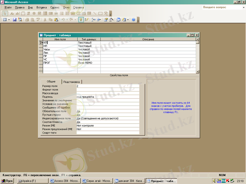 Предмет кестесінде ПРОГР атты өріс қарастылылған. Бұл өрісте өте ұзын текст орналасады. Бұндай өрістертер үшін Поле МЕМО типтес мәліметтерді таңдаймыз.