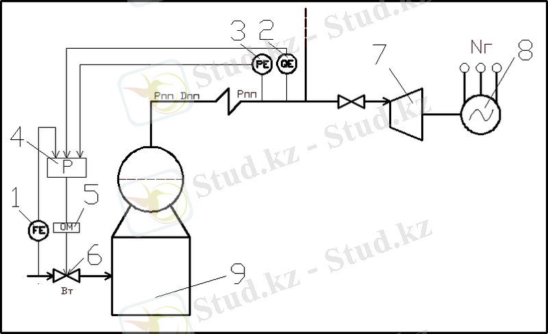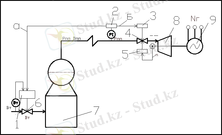 1 - отын шығыны датчигі; 2 - бу шығыны датчигі; 3 - бу қысымы датчигі; 4 - оттық бергішті реттеуіш құрылғы; 5 - орындаушы механизм; 6 - отты басқару органы; 7 - турбина; 8 - генератор; 9 - қазандық.