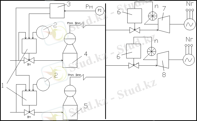 қысымы сихронизаторға 3 деген әсермен шектеледі(желі б) . Рететуіштегі 2 будың қысымы бойынша сигнал синхронизаторға 3 келіп түседі, ол турбинаның 4 клапанына әсер етеді. Базалық режимде реттеуіш 2 реттеудің П- заңын орындайды, яғни қысым бойынша бірқалыпсыздықпен жүктемеге тәуелді түрде әрекет етеді. Жалпы бу өткізгішпен жалғанған қазандықтар тобындағы будың қысымын реттеу үшін 2. 2 суретте көрсетілген сұлбаны қолданады. Бұл сұлбада Рм қысымының ауытқуы бойынша жалпы бу өткізгіштегі сигнал оттықтағы реттеуішер 1 үшін формаланатын қысымның бас реттеуіші қолданылады. Қосарланған бу жүктемесін реттеуде әрбір қазандықтың қатысу бөлігі қолдық басқарудың 2 берілісімен орнатылады.