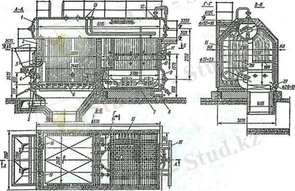 1-сурет. ДКВР - 6, 5-13 бу қазаны: 1 - жоғарғы барабан; 2 - бүйірлік экран; 3 - отын лақтырушыға ауаны жеткізу; 4 - пневматикалық лақтырушы; 5 - үрлеуші жапқыш; 6 - жел тарткыш тор; 7 - тіреуші рама; 8 - үрлеуге арналған потрубок; 9 - төменгі барабан; 10 - қайнатушы құбырлар; 11 - үрлеуші құрылғы; 12 - буды үрлеп алып кетуге арналған штуцер; 13 - қоректендіруші суды жеткізуші; 14 - жанып бітуші камера; 15 - буды қыздырушы; 16 - алып кетуді, қайтарушы құрылғы; 17 - газды қақпа; 18 - айналдыра қалаушы; 19 - ысырмалы құбырлар; 20 - төменгі камералар.