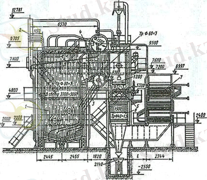 2-сурет. Белгородтың қазандық жасау зауытының ГМ-50-14/250 қазандық агрегаты: 1 - жағушы камера; 2 - алып шығушы циклон; 3 - фестон; 4 - қазандык шоғыр; 5 - бу қыздырушы; 6 - құбыршалы ауа қыздырғыш; 7 - шойынды су үнемдегіш (экономайзері) .