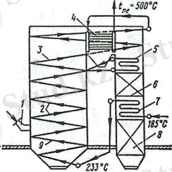 3-сурет. Рамзиннің тура дәлдік қазандық агрегаттың принципті сүлбесі: 1 - жанарғы; 2 - радиационды бөлігі; 3 - радиационды бу қыздырғыш; 4 - конвективті бу қыздырғыш; 5 - өтпелі зонаның жылан түтігі; 6 - ауа жылытушының бірінші сатысы; 7 - конвективті үнемдегіш; 8 - ауа жылытқыштың екінші сатысы; 9 - радиационды үнемдегіш.