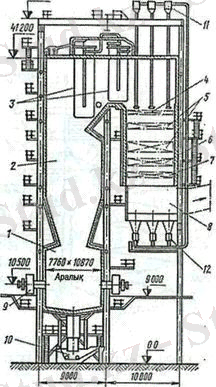 4-сурет. Тура дәлді қазандық агрегаттың, артық алмағайыпты қысымы: 1 - жағушы алды; 2 - түгел жану камерасы; 3 - керме; 4 - бірінші бу қыздырғыштың конвективті бөлігі; 5 - аралық бу қыздырғыш; 6 - булы - газды жылу алмастырғыш; 7 - үнемдегіш; 8 - ауа жылытқышқа түтінді газдарды алып кетуге арналған (суретте көрсетілмеген) ; 9 - шаң-тозаңды көмірлі жанарғы; 10 - шлак алып кетуші құрылғы; 11 - бытрақұрылымды қондырғылы циклон; 12 - бөлшектерді ұстауға арналған бункер.