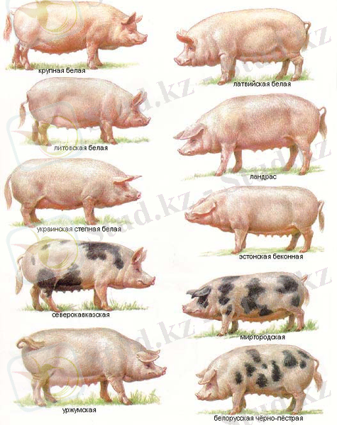 Елімізге әкелінген негізгі тұқымдар - ірі ақ, беркшир, ақ қысқа құлақ, ақ ұзын құлақ, ірі қара және ландрас болды.
