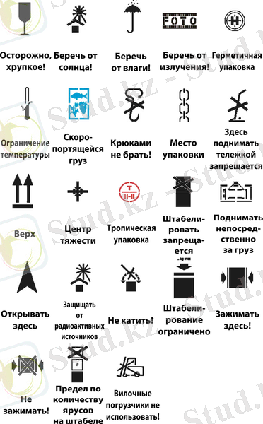 Ескерту белгілері жүк өңдеу дұрыс жолын көрсетуі тиіс - «нәзік Абайлаңыз!»; б) - «қабылдауға тікелей емес ілмектері»; с) - «дейін, сақтықпен өңдеуге»; г) - «жылу қорқады»; е) - «Строповка орналастыру»; е) - «ылғалдылық плетется» қорқып; г) - «ауырлық орталығы»; з) - «желімделген контейнерлер»; і) - «сәулеленудің қорқады».