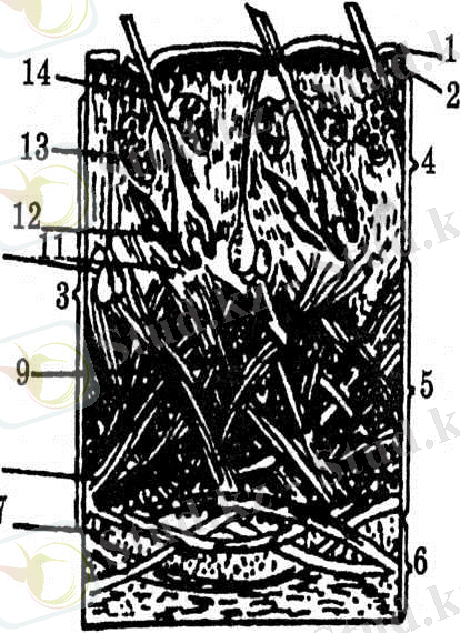 7-май қабаты; 8- коллагенді талшықтар тобы; 9- коллагенді талшықтар тобының көлденең (қиындысы) кесілгендегі көрінісі; 10- тері бездері; 11- мускулдар; 12 - түк қалташасы; 13-май бездері; 14- түк.