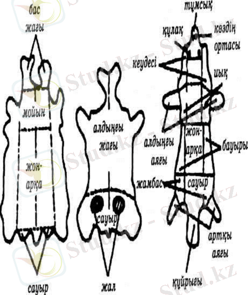 а - мүйізді ірі малдың терісі; б- жылқы терісі, штрихпен белгіленген ең қалың тығыз жері жая - «Шпигель»; в - тиін терісі