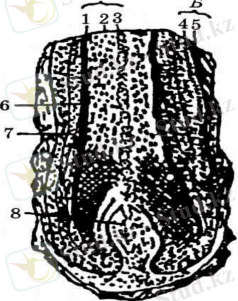 4 - түк қалташыгының ішкі қабаты; 5- түк қалташыгының сыртқы қабаты; 6- түктің бүршігі; 7- түк тамырының ішкі жағы;