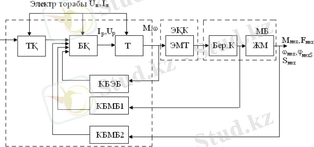б) электр қозғалту құрылғы (ЭҚК) - электр энергияны механикалық энергиясына түрлендіретін электрмеханикалық түрлендіргіш (ЭМТ) ; в) күштік түрлендіргіштен (Т), басқару құрылғыдан (БҚ) тапсыру құрылғыдан (ТҚ) жəне кері байланыс бергіштерден (электрлік ҚБЭБ жəне механикалық КБМБІ, КБМБ2) құралған
