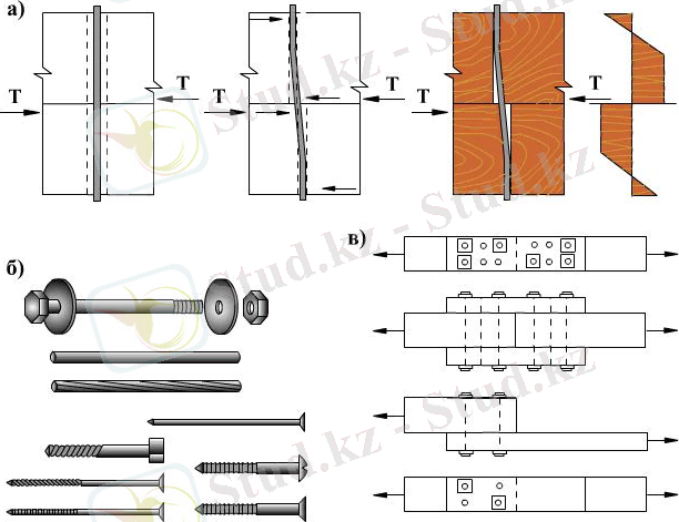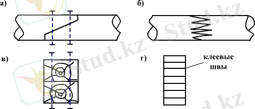 а- қисық шабу; б- желімделген тісті қосылыспен; в- болтпен; г- желім көмегімен.