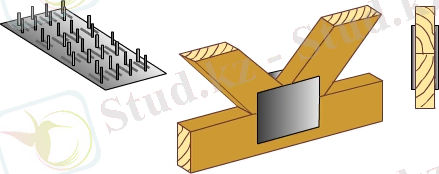4. Металлды темір пластинкалар (МЗП), 1-2мм цинктелген болаттан жасалған жазық бетті, бір жағында әртүрлі ұзындықты тістері бар пластиналарды айтады. Оларды элементтің екі жағынан қояды (сурет 15, 6) . Орнату арнайы пресстеу құрылғысымен жүргізіледі.