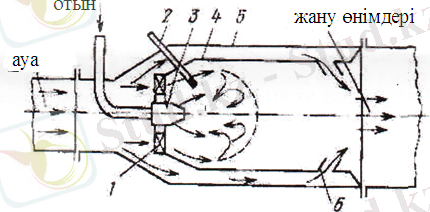 1-ауа бағыттағыш қондырғы; 2- тұтандырғыш; 3- бүркіп шашу қондырғысы; 4- жалынды (ыстық) құбыр; 5- корпус; 6- араластырғыш.
