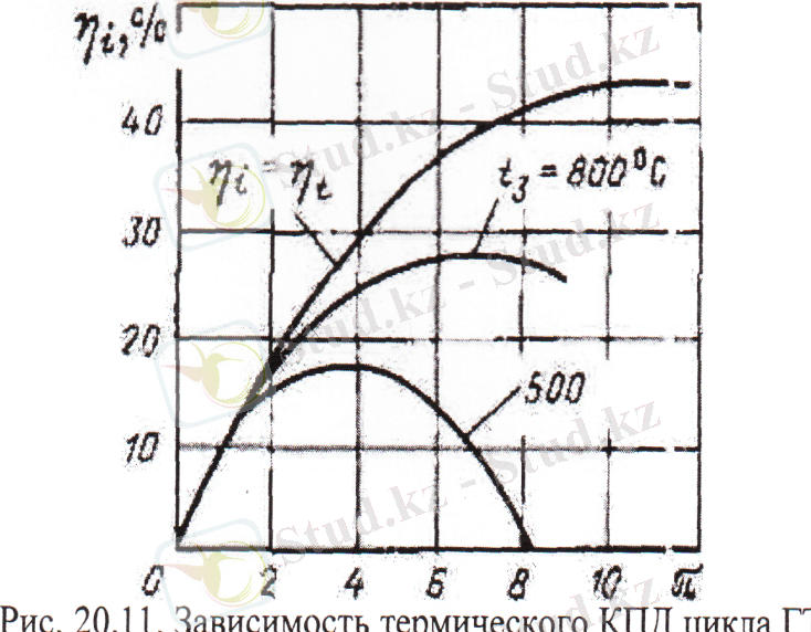 Сондықтан, идеалды циклдан қарағанда, нақтылы циклдың эффективтілігінің көп бөлігі қысымның белгілі бір мөлшерінде (оптималды) байқалады, сонымен қатар Т 3 - ке әрқашан өзінің π опт мәні сәйкес болады, (2-сурет) . Қарапайым ГТҚ-ның ПӘК-ті (14÷18) %-дан аспайды, ал оны көтеру үшін ГТҚ-да бірнеше сатылы жылуберілулер және сығылатын ауаны аралық суыту қолданылады. Онымен қоса турбиналардан кейінгі өтелген газдармен сығылған ауаны регенеративті жылыту арқылы нақтылы циклды Карно циклына жақындатады.