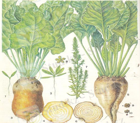 Сурет 44. Қант қызылшасы. 1, 2 - егін көгі және нағыз қос жапырақ кезеңдеріндегі өсімдіктер; 3, 4 - эккендорфская желтая малазықтық қызылшасының І-бірінші жылғы өсіп-даму кезеңіндегі өсімдігі және тамыржемісінің көлденең қимасы; 5, 6 - қант қызылшасының өсіп-дамуының бірінші жылғы өсімдігі және тамыржемісінің көлденең қимасы; 7 - гүлді сабақтың бір бөлігі; 9 - көпөскінді және бірөскінді қызылша жемісшесі; 10 - тұқымы.